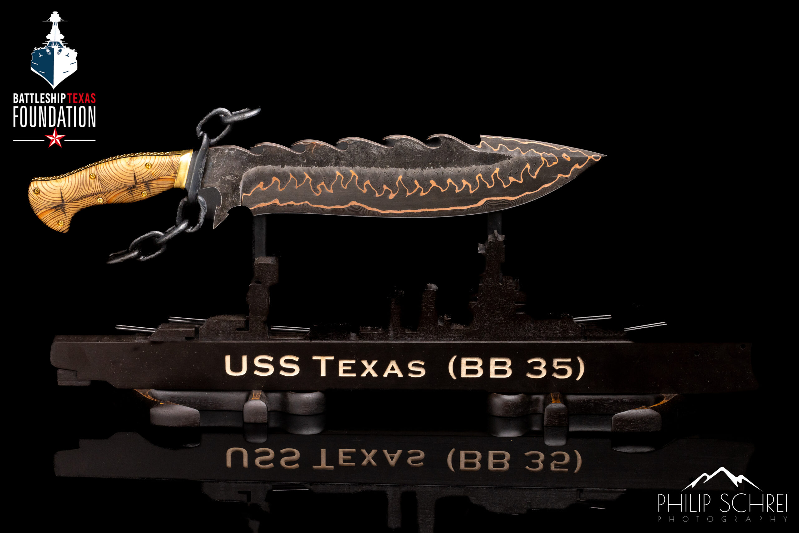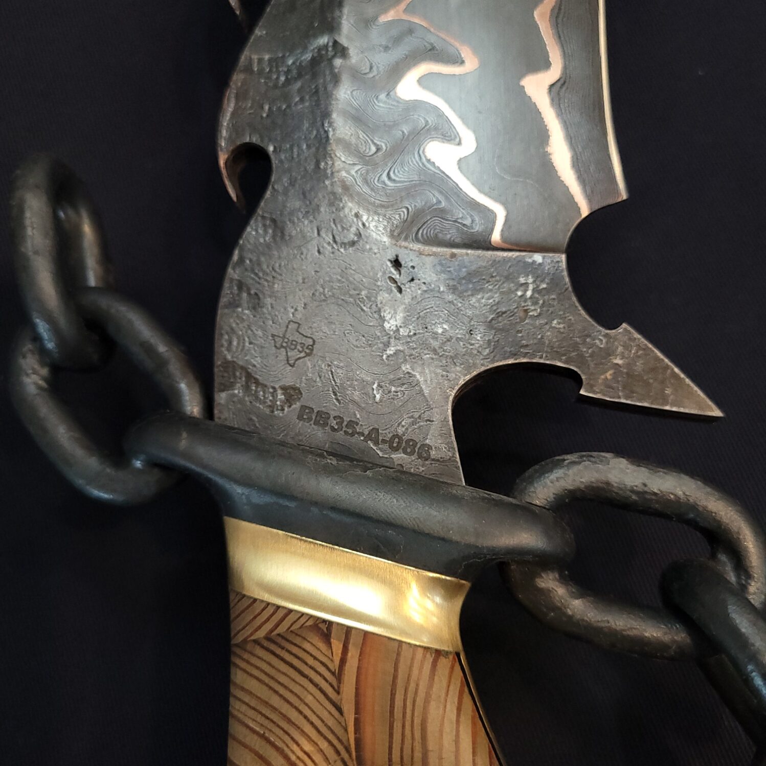 Hundreds of hours went into the planning and execution of ‘The Abyss’. The blade is over 300 layers of 1084, 15n20, copper and the Battleship Texas steel running down the side of the blade. We teamed up with Coy Baker with Baker Forge to make the billet. The handle is mosaic tiled pattern deck wood. It is sporting a brass frame, spacer & hardware. The guard is constructed from an old chain. The stand is curly maple.