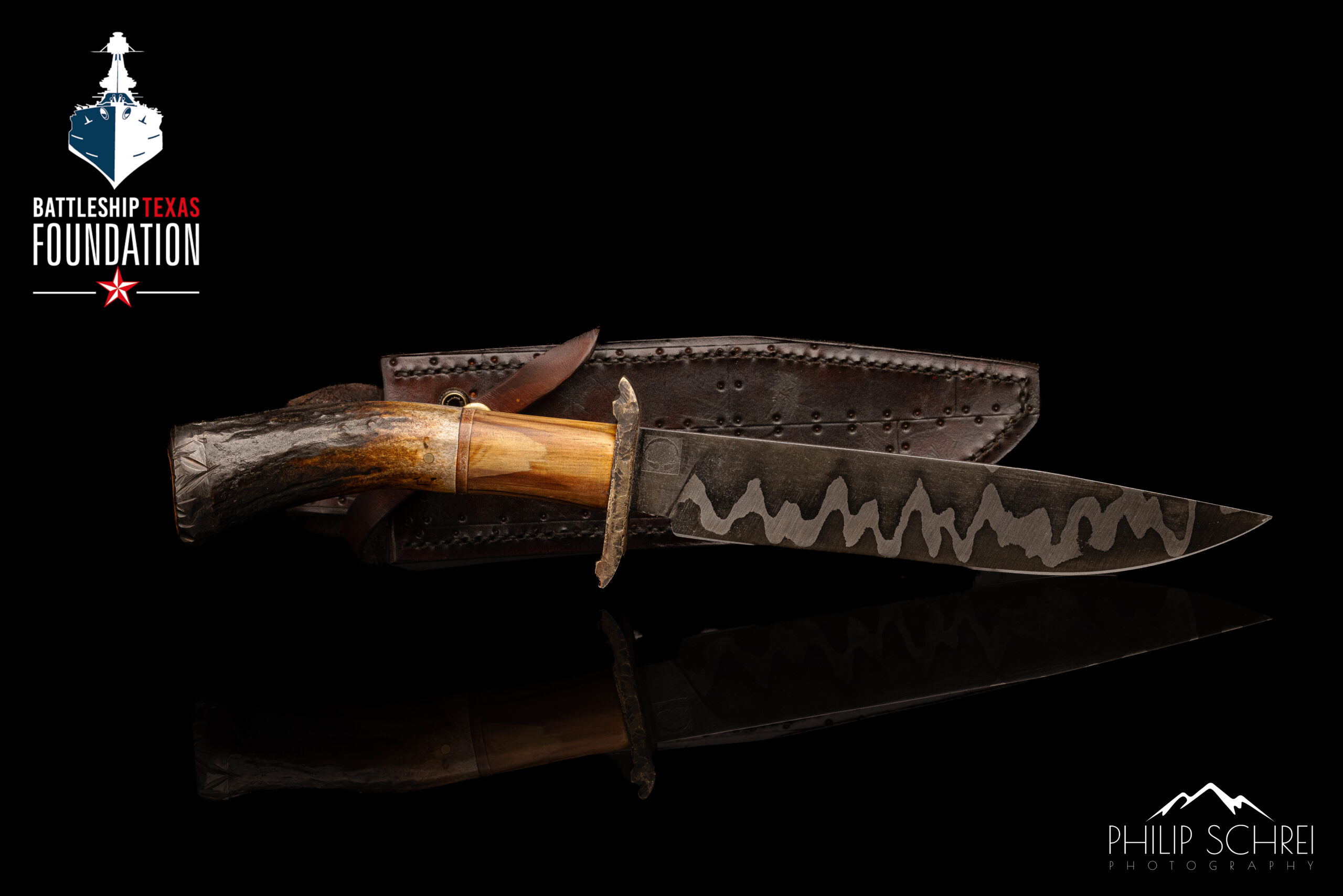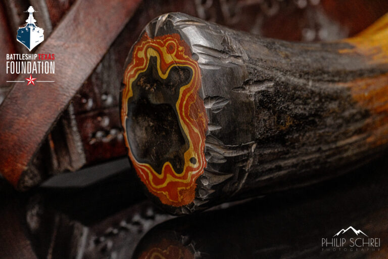 The blade of this bowie is forged by San Mai pattern. The handle is a combination of antler and deck wood. The pommel is torpedo blister steel that has been worked to match the contours of the antler. The pommel features layers of paint that were applied throughout the Battleship Texas’ history.