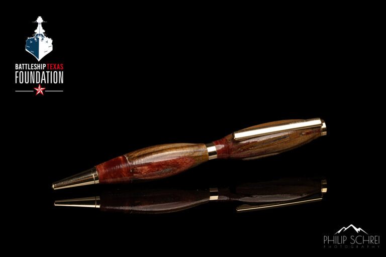 This pen is crafted from hand turned deck wood from the Battleship Texas. Colored resin was used to stabilize the wood and fill gaps from weathering, giving it a unique look.