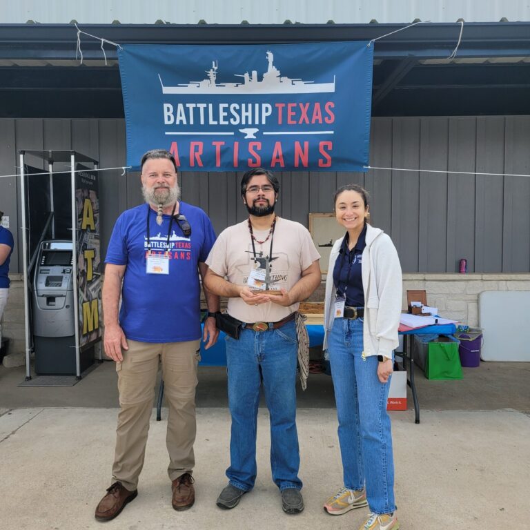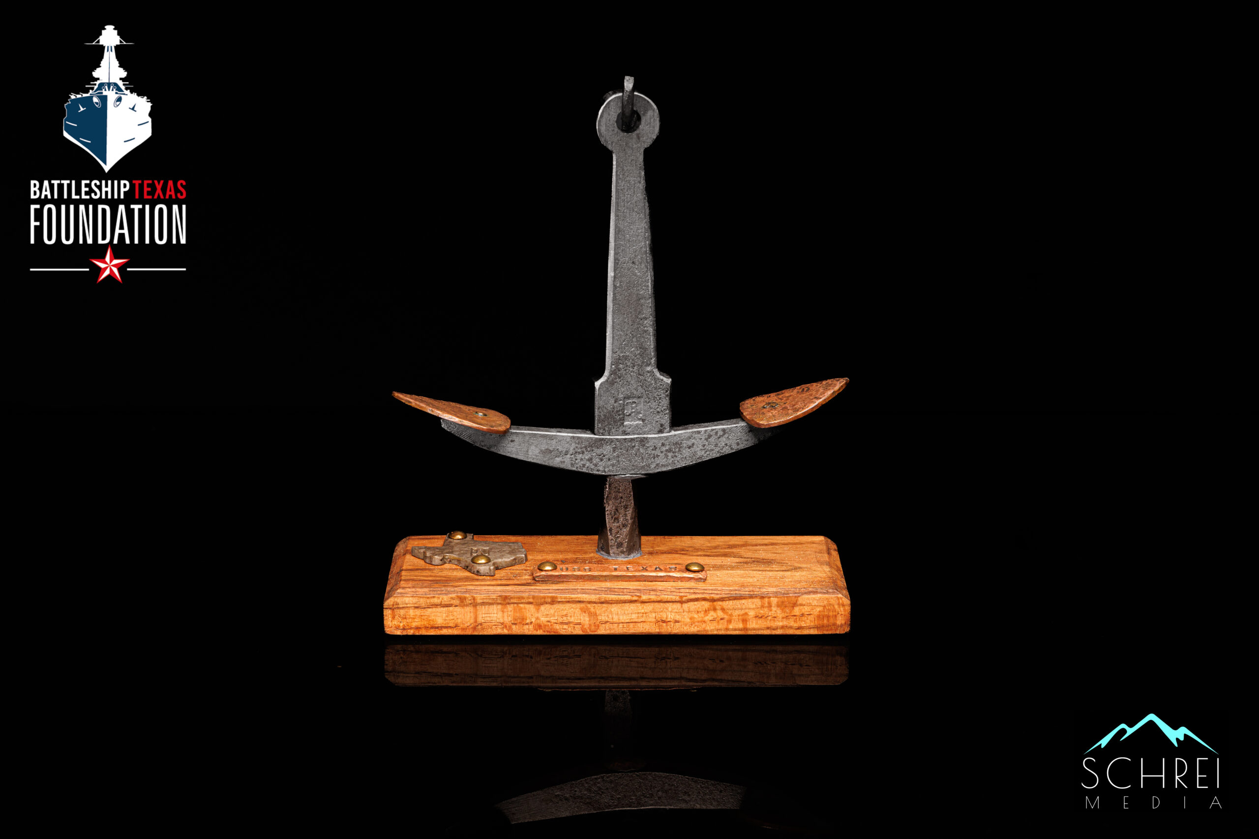 Desktop sized anchor forged from steel recovered from the Battleship Texas with copper highlights.