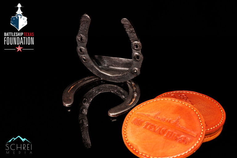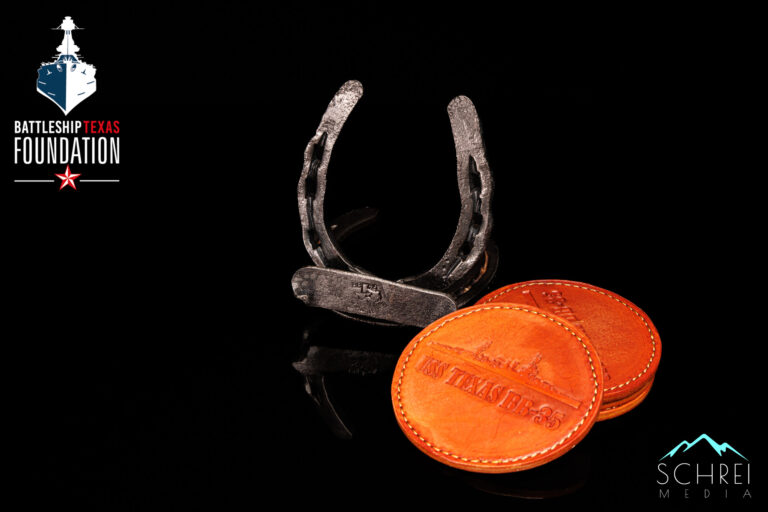 David Lowry made ten sets of these coasters. The upright horseshoe is hand forged from steel reclaimed from the Battleship Texas. Each of the four leather coasters included in the set are stamped with the silhouette of the USS Texas.