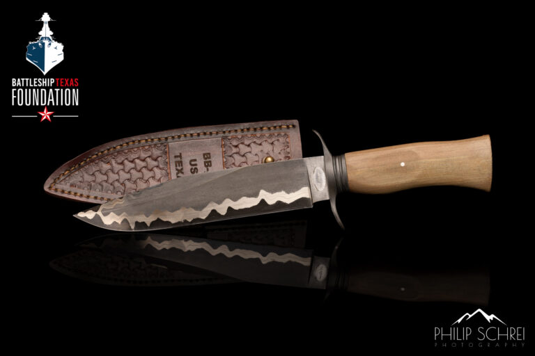 The handle is stabilized long leaf pine from the deck wood of the USS Texas.
